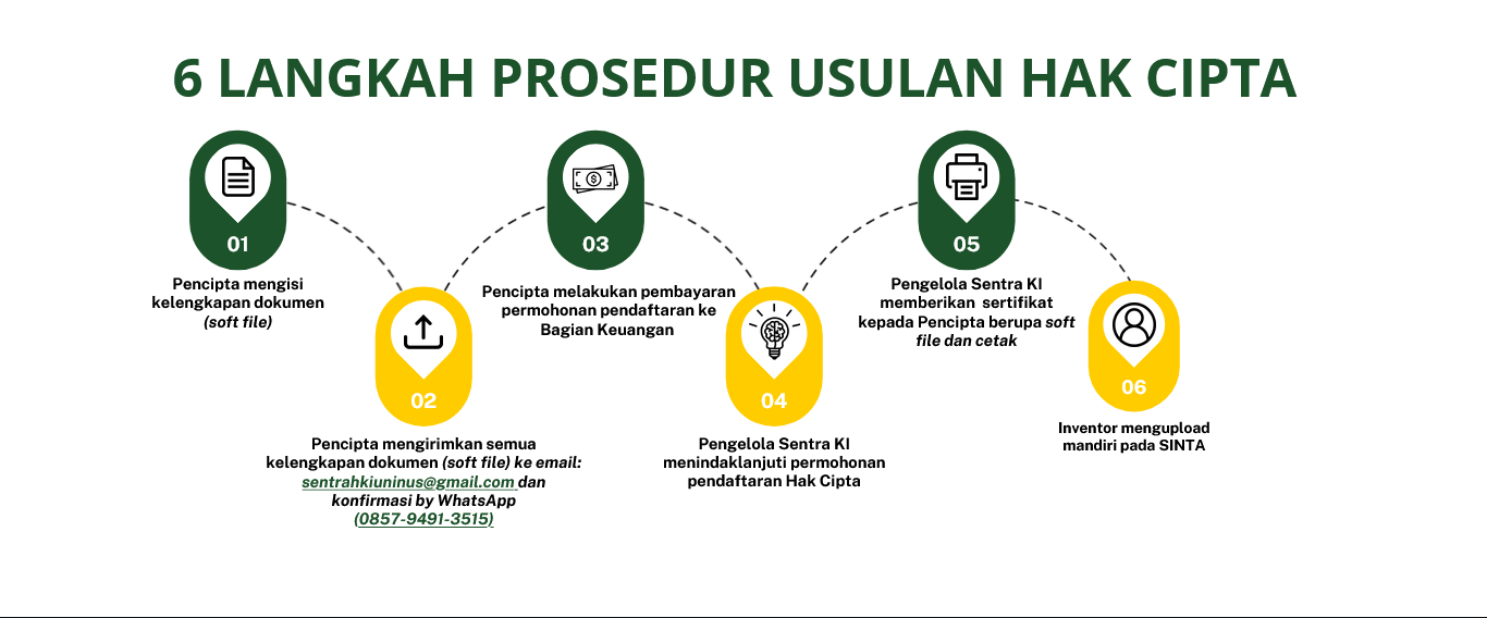 Pengusul mengisi formulir permohonan pendaftaran Kekayaan Intelektual (hak cipta) dan mengisi data pencipta, surat pernyataan, dan surat pengalihan hak cipta yang bisa didownload pada situs Sentra KI LPPM Uninus;